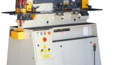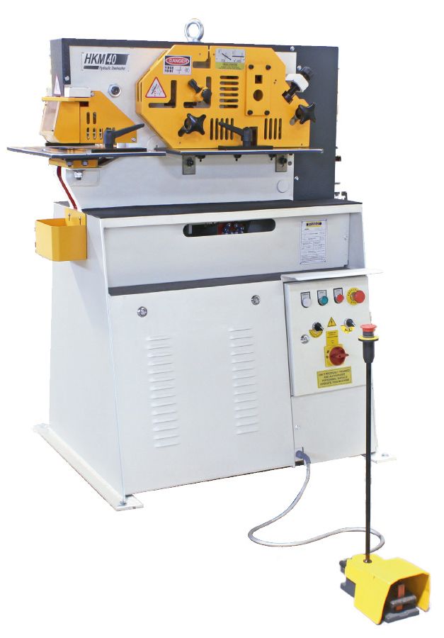 Prensa Metaleira Hidráulica 4 Estações 1 Operador Capacidades: 40 ton Funcionalidades padrão: Furação por Puncionamento, Corte e Barra Chata, Corte de Cantoneira, e Corte de Chapas Grossas. Capacidade para Corte de Perfil U, Perfil I, Perfl H, e Perfis Especiais.