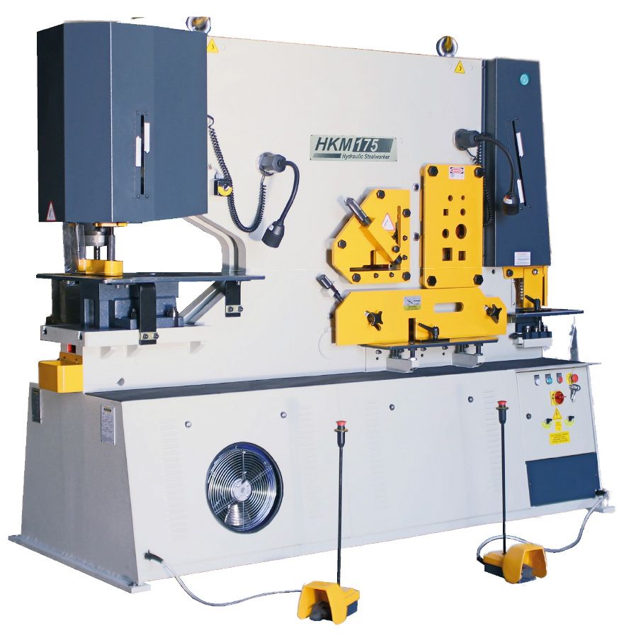 Prensa Metaleira Hidráulica 5 Estações 2 Operadores Capacidades: 65 ~ 85 ~115 ~175 ton Funcionalidades padrão: Furação por Puncionamento, Corte e Barra Chata, Corte de Cantoneira, Corte de Chapas Grossas, e Corte de Rasgos. Capacidade para Corte de Perfil U, Perfil I, Perfl H, e Perfis Especiais.